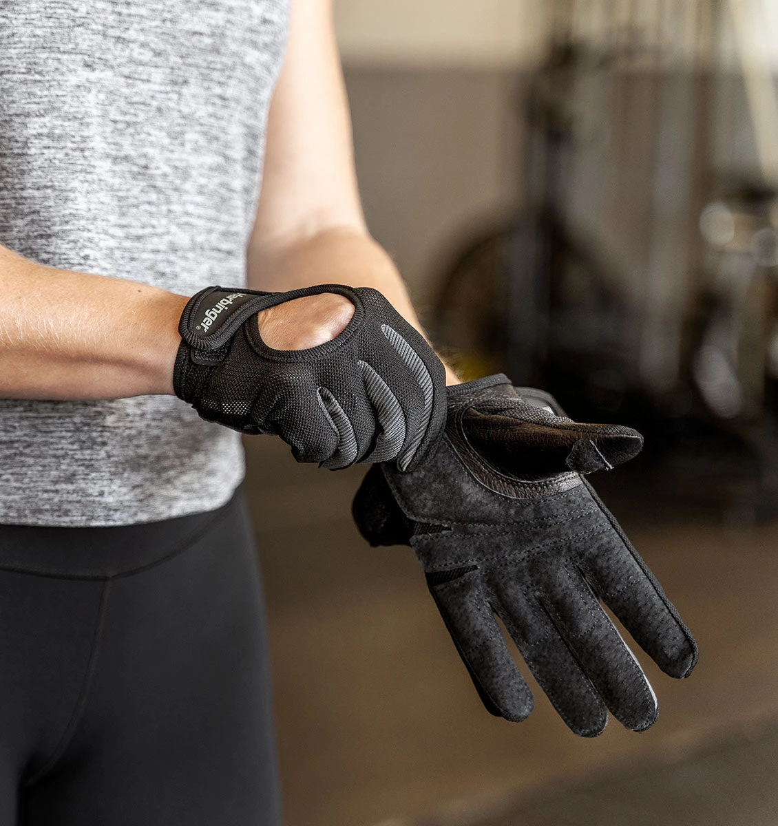 - Full-finger touchscreen friendly fitness gloves with leather palm
