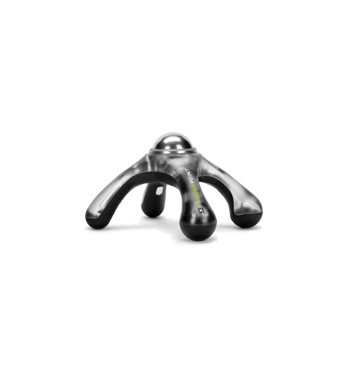 The TriggerPoint Targeted Hand Massager – Grey features a unique design for relieving tension and pain in the hands. It includes four non-slip legs for easy placement on a desk, and stainless-steel ball for rolling out sore hands.